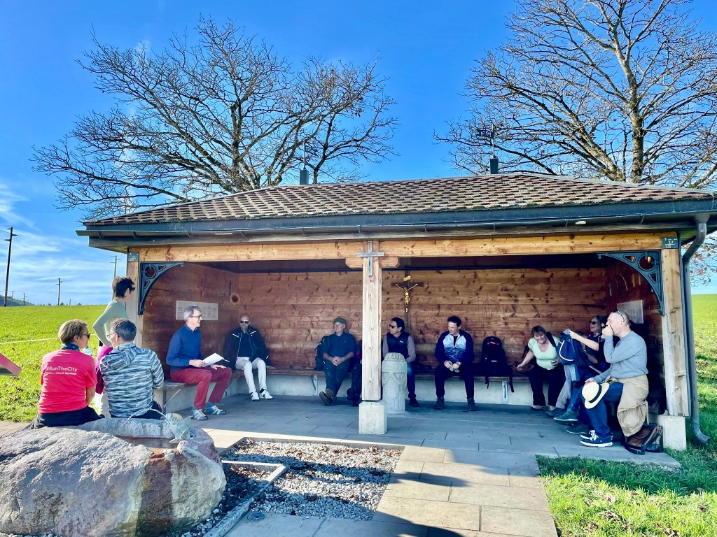 Rundbild, unter anderem mit der Kreuzigung Jesu. Wir versammelten uns im Schein