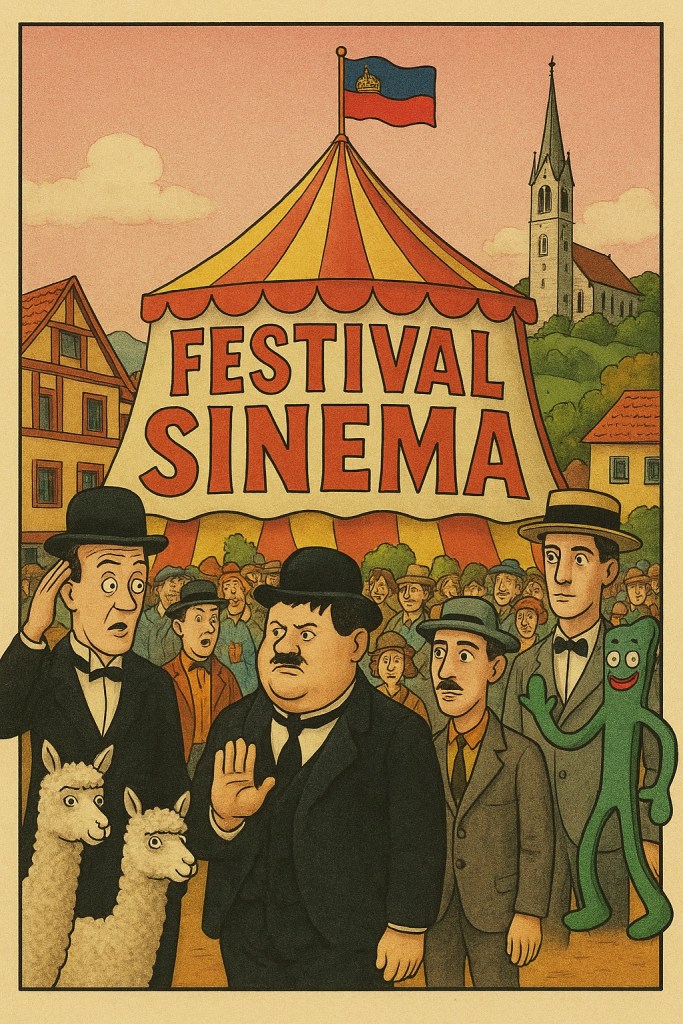 Offiziell wird es um 17 Uhr… Welcome-Apéro im wunderbaren Skino in Schaan; dies mit Präsentation des Sensationsfundes: Aristoteles verschollenes, zweites Buch der Poetik. Politisch wird es dann zur Eröffnung des Festivals: Sebastian Frommelt, Direktor der Kunstschule Liechtenstein, wird über die Weltherrschaftsansprüche der Liechtensteiner reden und dabei einen hofnärrischen Einblick ins monarchische Ländle werfen. Anschliessend wird Film #01 die hegemonistischen Tendenzen des Kleinstaates untermauern, bevor wir uns zusammen im einheimischen Rössle die Bäuche vollschlagen.
